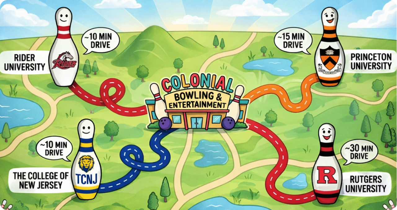 Welcome to Colonial Bowling & Entertainment — your full-service family entertainment center in Lawrenceville, NJ. Whether you’re here for a fun night out, a birthday celebration, or just some relaxed hanging out, we've got something for everyone.