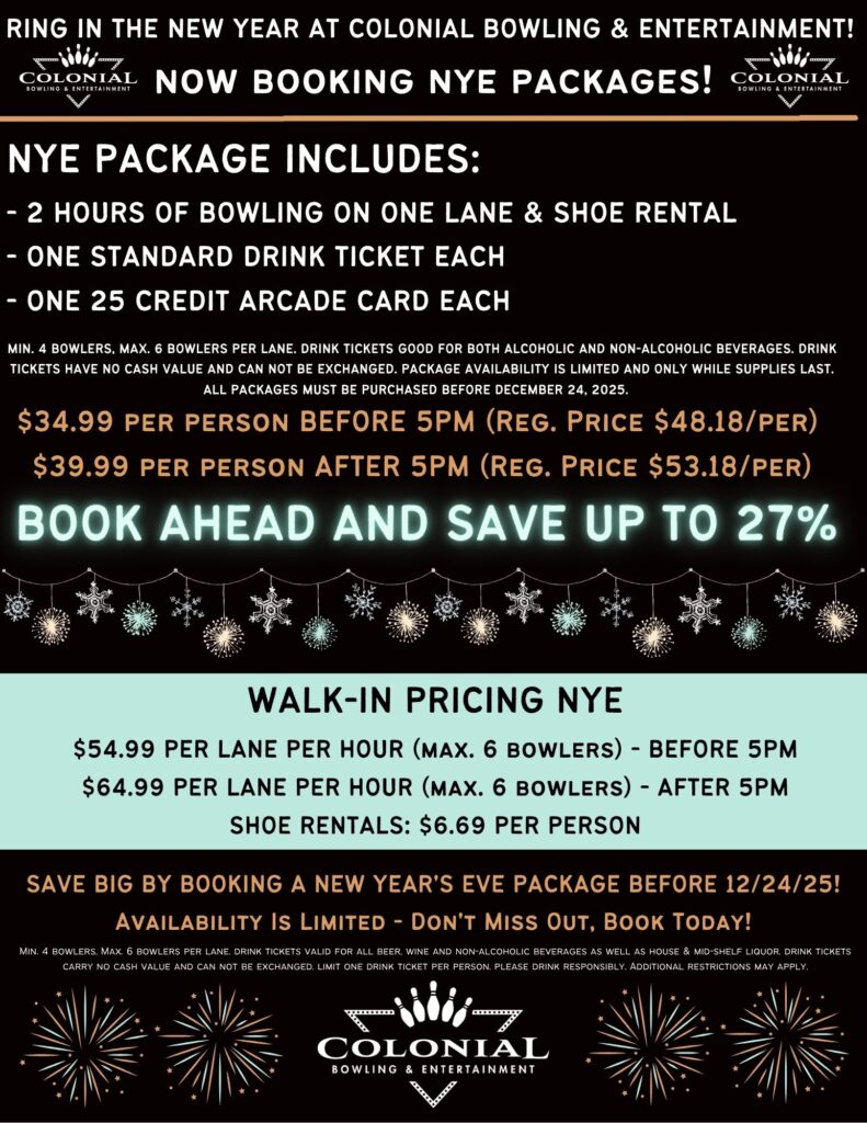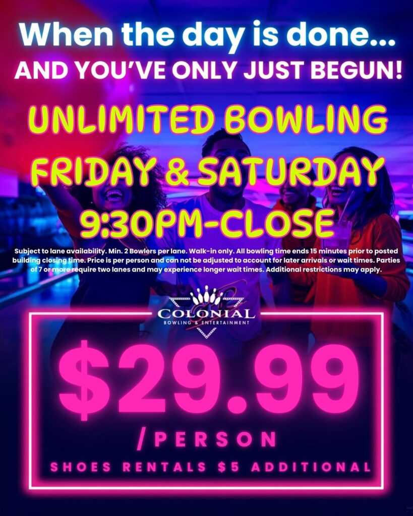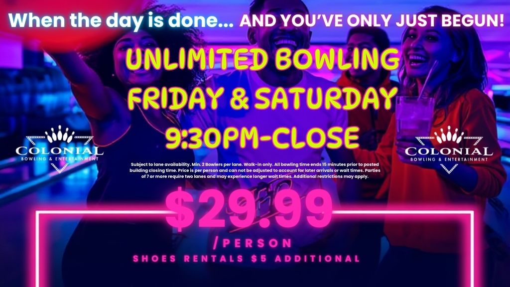 REGULAR WEEKLY SPECIALS MAY NOT BE AVAILABLE ON DAYS PRECEDING OR FOLLOWING HOLIDAYS. COLONIAL BOWLING MAY ALSO DESIGNATE CERTAIN DAYS AS HOLIDAYS EVEN IF THEY ARE NOT FEDERAL HOLIDAYS. PLEASE CALL FOR AVAILABILITY OF SPECIALS AROUND ANY HOLIDAYS AND DURING SPRING BREAK.